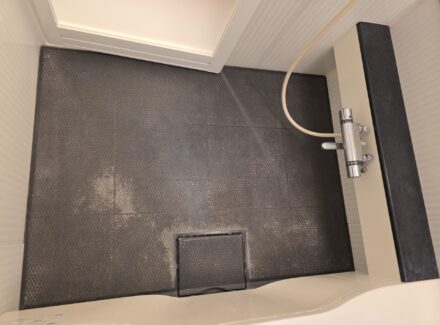 お風呂の床に専用フロアを貼るだけのリニューアル工法です。ユニットバスはもちろん、在来浴室のタイル床やモルタル下地にも対応可能です。
