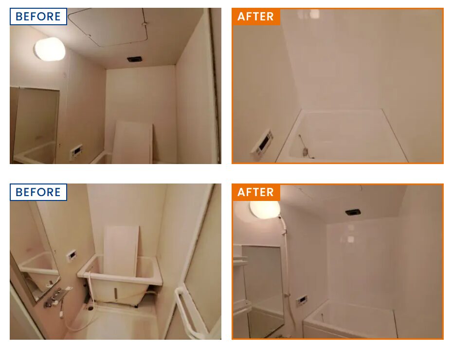 浴槽吹付塗装、壁パネル貼り、床シート貼り