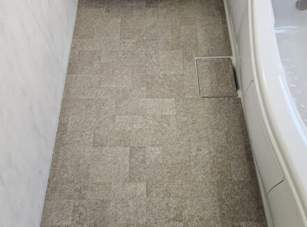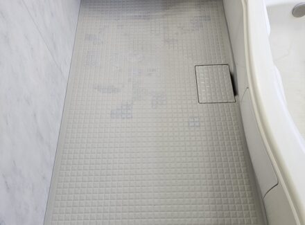 また床シート貼りリフォームのフロア・ビューティは、お風呂の床に専用フロアを貼るだけのリニューアル工法で、ユニットバスはもちろん、在来浴室のタイル床やモルタル下地にも対応可能です。床シートは既存の床の上から貼り付けることができるため、床を解体する必要がなく、工期が短くて済みます。